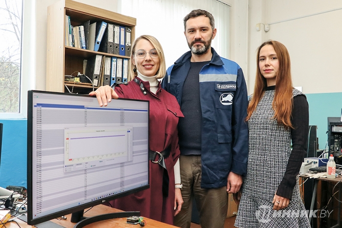 Оксана Никонович, Павел Кротов и Юлия Черник. На мониторе – интерфейс системы регистрации