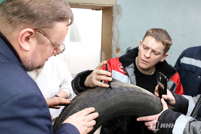 Обмениваясь короткими репликами, специалисты внимательно осматривают шины под всеми возможными углами, в какой-то момент в дело вступает мерительный инструмент. Вскоре озвучивается вердикт: выявлен односторонний износ рисунка протектора и усиленный износ рисунка по центру. Дефекты явно указывают на нарушение режима эксплуатации: повышенное давление в шинах, а также проблемки с подвеской автомобиля.