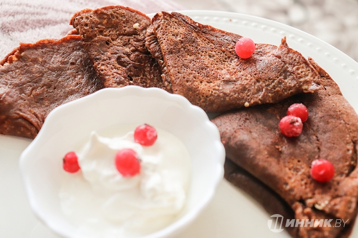 «Шоколадно-творожные блины» прекрасно подойдут тем, кто «избегает» мучного. Для приготовления понадобится 300 г творога, 4 яйца, 40 г сахара, по 30 г какао, муки, масла растительного, 1-2 ст. л. молока (если потребуется), щепотка соли, 1 ч. л. разрыхлителя.
